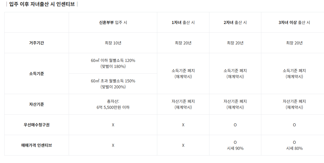 - 우선매수권: 자녀 2명 이상 시 시세 80% 가격으로 매입 가능