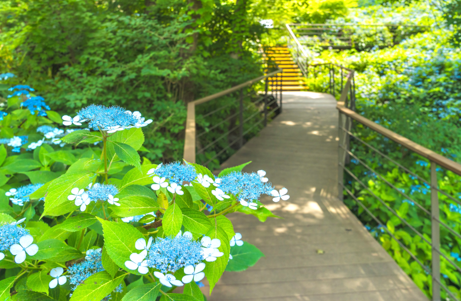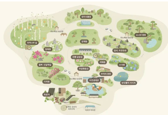 입구 → 이끼원 → 소나무정원 → 암석하경정원 → 정상 전망대 → 분재원 → 전통담장길 → 색채원 → 수국원 → 출구